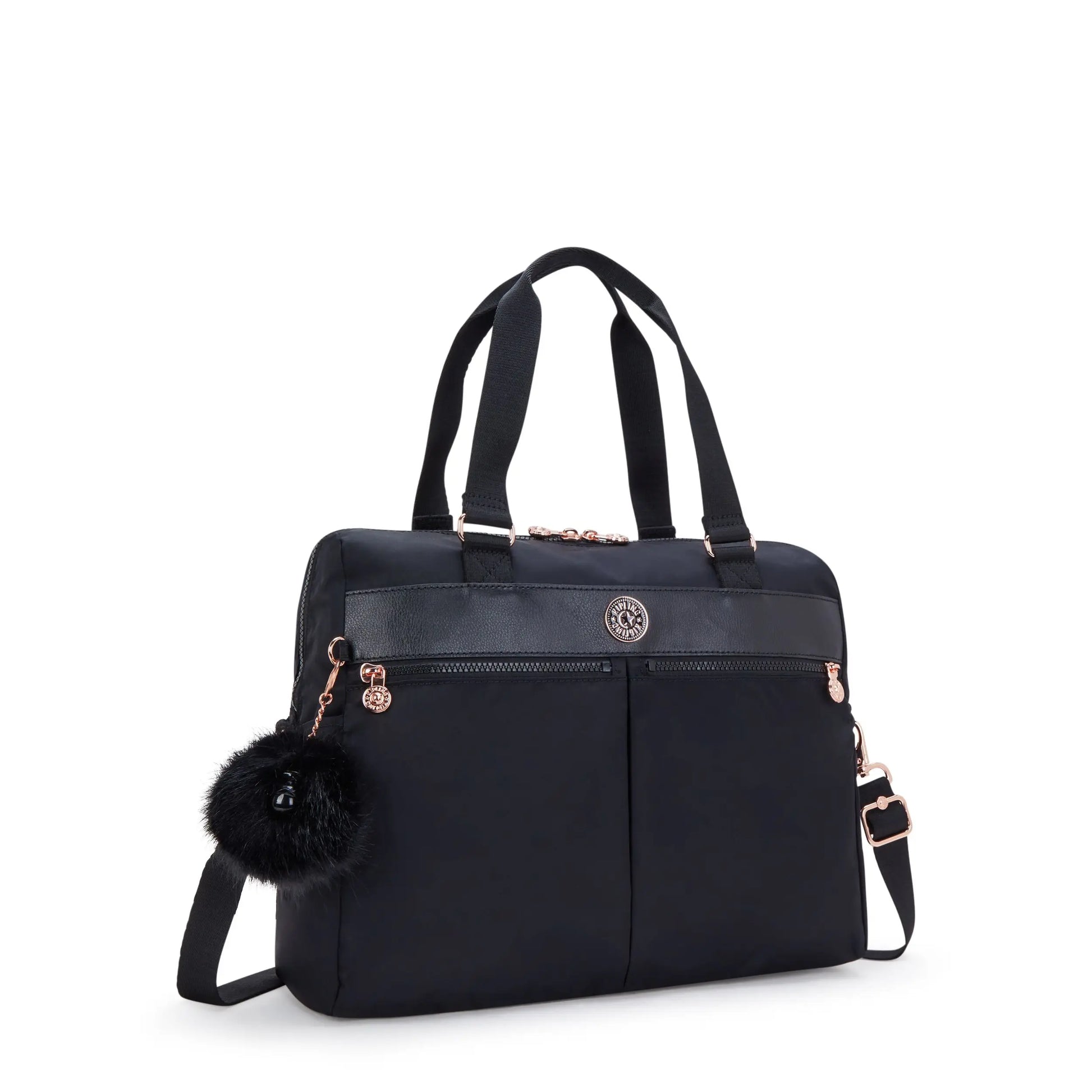 El diseño funcional de Valeria la convierte en la bolsa de trabajo ideal-/- Guarda tu laptop de forma segura en la funda para portátiles junto con uno o dos cuadernos-/- Llévala cómodamente en el hombro o con las asas de transporte duales-/- Diseñada en un elegante color negro con cremalleras doradas y elegantes acentos, Valeria es imprescindible para quienes buscan viajar con estilo-/-